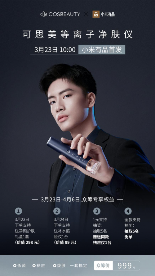 3月23日,小米有品众筹上架了一款祛痘产品,零售价1999元,众筹价仅为999元。该产品是COSBEAUTY可思美专为痘痘肌研发的觉醒系列新品,采用等离子核心技术灭菌祛痘,搭配护肤品以温和、安全的形式为用户提供从祛痘、预防痘坑到改善痘印的皮肤健康解决方案。这是可思美继去年电激光生发仪打破小米有品众筹单品交易额记录后与小米有品的第二次携手,新品众筹活动一经启动,便吸引了业界和米粉的热烈关注。