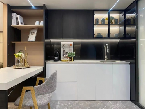 通过岩板经过加工,全屋智能衣橱系统及柜类产品都可实现柔性定制,为消费者提供个性服务,比如:用户可以选择同一花色的不同厚度的岩板作为门板和台面,轻松兼顾美观和实用两种诉求。