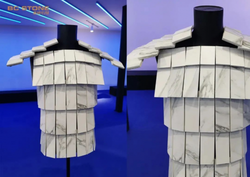 展会现场用人造石搭建而成的“魔方”,既是休憩石凳,又是石艺秀场,新颖别致吸人眼球。用岩板制作的战士铠甲,以创意设计赋予石材新的生命力。