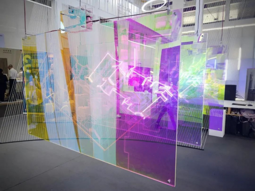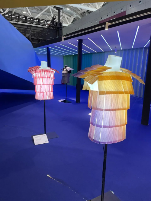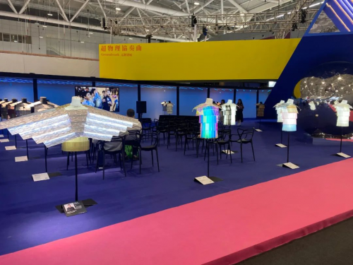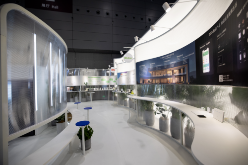 在1号馆的哈尔滨工业大学学院x杰恩设计的展位内,定制了幻彩卡乐板悬挂装置和长凳。幻彩卡乐板和交互设计相结合,带来更多的设计变化,更具未来感。