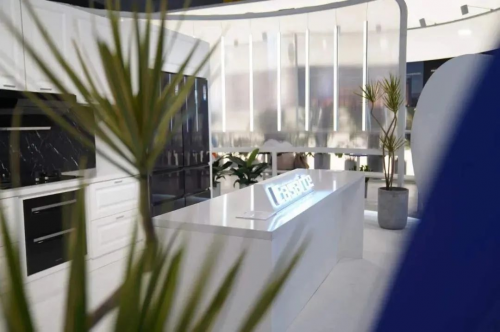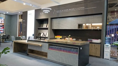 全岩家居定制馆主要体现:第一个是新,第二个是全,第三个是个性化。实现家居全案输出,引领潮流、追求个性化与品质生活的心理与消费需求,展馆内能看到大幅面的岩板背景墙,整体厨房、衣柜,岩板不止运用于家居空间各种需求,还有移动家具如餐桌、电视柜等等。
