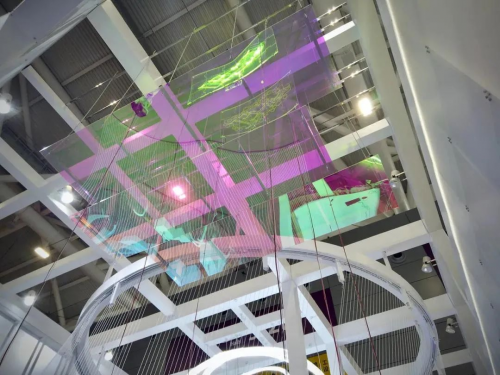 展览形态概念源于细胞,透光材料有无限的可能性,如同细胞,经过组合、生长带来无限潜能和生命,就像材料,为他物赋予生命。通过大面积悬挂渐变墙的形式展示卡乐板材料的性能,技术的优势,色彩的丰富变化,给大家提供卡乐板材料运用的想象力空间