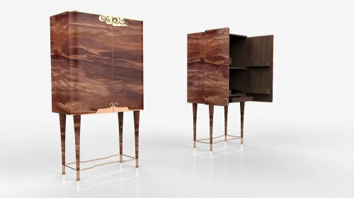 “悟空”系列作品设计将西游记孙悟空经典元素提炼,来自于印度“胡桃红”天然石英石,使用柜体/纤薄材弯折以及支脚/实心石材穿管工艺,把古典符号和当代石材工艺结合,传播祥和文化,传递东方美学。