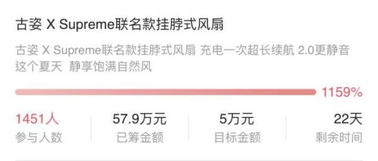 正是因为契合的态度、理念与审美,GUZI古姿和Supreme联合推出最新挂脖风扇。2021年3月21日,Supreme x GUZI联名款挂脖风扇上线造点新货(原淘宝众筹),7日实现10倍增速。15日达成率更是高达2000%,成交直破百万。