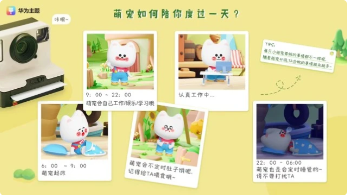 萌宠会给主人提供贴心提醒、真挚随同、趣味交互等独特暖心功能,带来轻松有趣的情感陪伴。例如:提供天气、星座、步数、电量的贴心提醒,为忙碌的生活增添温暖;与主人每日云同步,起床、工作、就餐、熬夜,带来日日夜夜的安心守护;还会按时为主人送上节假日、生日祝福,为彼此点亮专属仪式感。此外,主人还可以每天给萌宠投喂食物助其成长,使养宠变得更加真实,幸福感油然而生。据悉,华为主题的桌面萌宠功能还会持续升级,后续将增加更多养成与互动,玩法也将不断丰富。