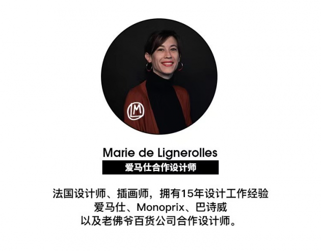 Marie de Lignerolles来自法国,拥有15年的设计工作经验,爱马仕、Monoprix、巴诗威以及老佛爷等知名大牌,都跟她保持密切合作关系,她也为各大知名品牌设计过成千上万的时尚艺术爆品。