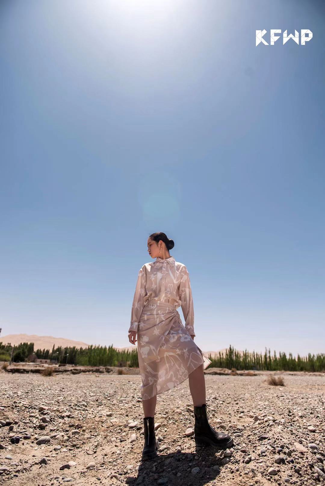 而达子设计的梵高·鸢尾花系列展现极简剪裁,凸显摩登意味,荒芜的戈壁环境更是让梵高的画中花显出瑰丽奇幻的美感,半身裙的小褶皱展现出少女们心境中的倔强,呈现勃勃生机。
