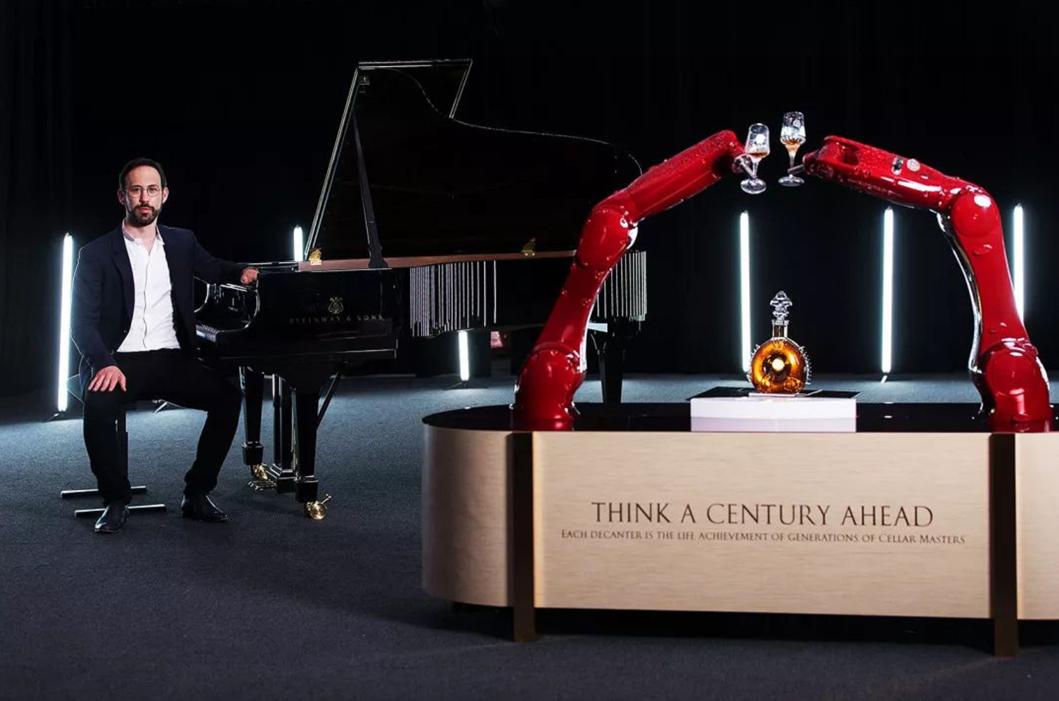 “时光之韵”由一对精密机械臂“磬之礼颂”开启,盛有路易十三干邑的专属品鉴杯互相触碰,奏响极具辨识度的升G调音符。以色列钢琴家亚伦·赫曼(Yaron Herman)由此谱写单音序曲,以钢琴演奏此枚音符,弦乐队同音衔接,呈现变化音高和多样节奏。第一小提琴担任主曲演奏,第二小提琴与中提琴配合增色,大提琴则涵盖了低音部。