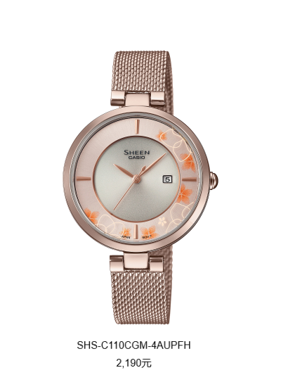 SHS-C110CGM-4AUPFH饱和度偏高的暖色调,金属编织表带,勾勒优雅线条,简约双针、日期显示设计,添加了花主题系列细致闪耀、简约率性的特点,将优雅风采定格其间。