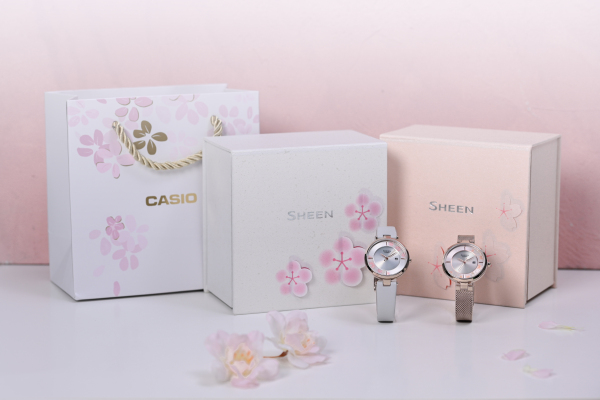 几乎每个女生都有幻想过穿着梦幻优雅的公主裙,手捧稚嫩淡粉花束,有一场心跳加速的邂逅。美好的想象总能让人疯狂分泌多巴胺,偶尔的小惊喜则把幻想带进现实,让幸福感直线上升。卡西欧SHEEN和风系列为你心爱的她量身定制惊喜,以浪漫日式极简美学作为灵感来源,用闪耀金箔点缀空白,粉嫩樱花定格优雅风采,把璀璨聚焦于腕间,时而光芒四射,时而柔情烂漫。