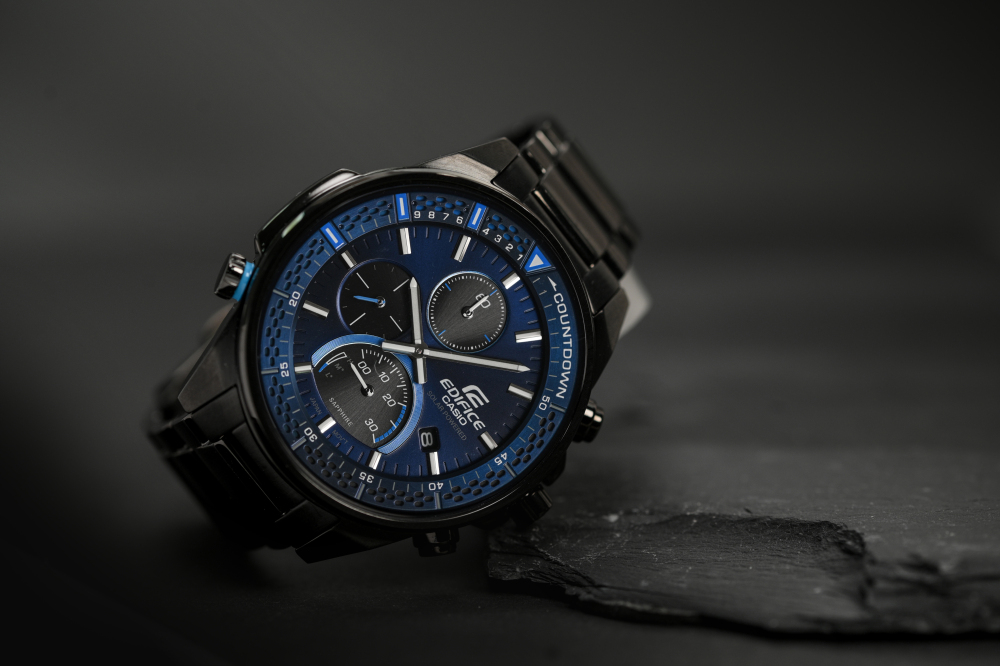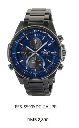 EFS-S590YDC-2AUPR 经典蓝黑组合,轻薄系列流线型的外形,经典的配色糅合潮流色系,充满科技感。搭配同色系的银白指针,与蓝色形成明显的对比,如繁星点缀于蓝空般,观感清晰,任佩戴者轻松把握时间。